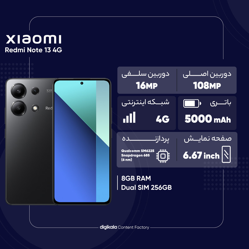 سری Redmi گوشیهای هوشمند میانرده شیائومی تا به امروز توانستهاند با بهره بردن از مشخصات فنی قدرتمند و البته قیمتی مقرون بهصرفه، عملکرد بسیار درخشانی را از خود به جای بگذارند و شیائومی Redmi Note 13 یکی از این میانردههای دوست داشتنی است که در برخی از مشخصات فنی در نظر گرفته شده امکاناتی در حد و اندازه یک پرچمدار را در اختیارتان قرار میدهد. این گوشی به صفحهنمایش با ابعاد 6.67 اینچ و رزولوشن 1080×2400 پیکسل از نوع امولد با نمایش 395 پیکسل در هر اینچ مجهز شده است. نرخ بروزرسانی 120 هرتز و حداکثر روشنایی 1800 نیت (nits) صفحهنمایش سبب شده تا عملکرد روان و بدون لگ را شاهد باشید و حتی زیر تابش مستقیم نور خورشید هم وضوح تصویر بسیار خوبی را در اختیارتان قرار میدهد. یک سنسور دوربین اصلی 108 مگاپیکسل در کنار سنسور 8 مگاپیکسل فوقعریض و سنسور 2 مگاپیکسل ماکرو در قسمت پشتی در نظر گرفته شده است. حضور سنسور دوربین اصلی قدرتمند سبب شده تا عملکرد بسیار خوبی را در زمینه عکاسی نور روز و نور شب شاهد باشید. بریدگی دایرهای شکل ناچ در قسمت بالایی و مرکزی صفحهنمایش، سنسور دوربین سلفی را در خود جای داده است. حضور پردازنده شش نانومتری Qualcomm SM6225 Snapdragon 685 هم سبب شده تا Redmi Note 13 در اجرای بازیهای محبوب و نرمافزارهای کاربردی، عملکردی کاملا قابل قبولی داشته باشد. باتری با میزان ظرفیت 5000 میلیآمپرساعت در کنار فناوری شارژ سریع 33 وات از دیگر مشخصات در نظر گرفته شده هستند. در محموع باید بگوییم که اگر به دنبال گوشی میانرده خوش قیمتی هستید که در برخی از مشخصات فنی در نظر گرفته شده حتی توانایی ارائه عملکردی در حد و اندازه یک پرچمدار را داشته باشد، شیائومی Redmi Note 13 میتواند یکی از گزینههای بسیار مناسب برای شما باشد.